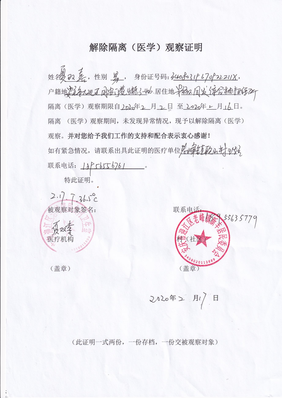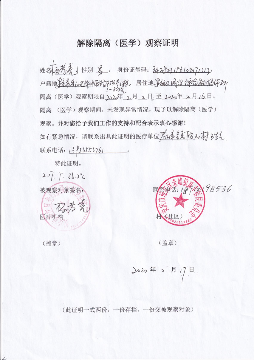2019年2月2日我司董事長親自帶三位司機赴武漢運送支援物資,返回當(dāng)天即自我隔離觀察,社區(qū)居委會和社區(qū)醫(yī)院兩家單位同時檢查各項指標(biāo)均正常,解除醫(yī)學(xué)隔離觀察。